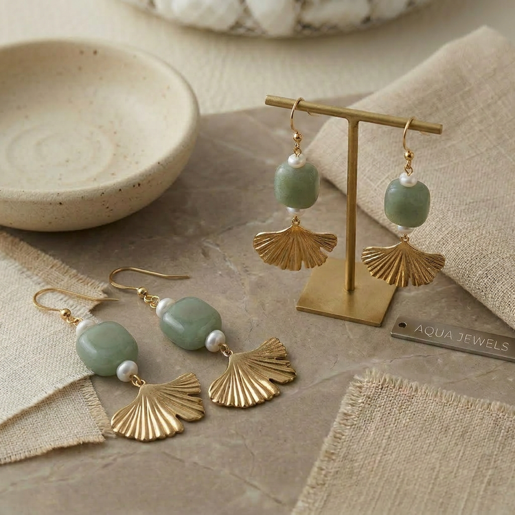 Κομψά σκουλαρίκια με πράσινο νεφρίτη (jade), λαμπερές πέρλες και μεταλλικό στοιχείο σε σχήμα φύλλου, εμπνευσμένα από τη φυσική ομορφιά της φύσης. Η απαλή πράσινη απόχρωση του νεφρίτη συνδυάζεται αρμονικά με τη διαχρονική κομψότητα των περλών, δημιουργώντας ένα εκλεπτυσμένο και θηλυκό κόσμημα. Το μοτίφ του φύλλου ολοκληρώνει τον σχεδιασμό με μια ρομαντική και φυσική πινελιά, ιδανική για να προσθέσει φρεσκάδα και κομψότητα σε κάθε εμφάνιση.