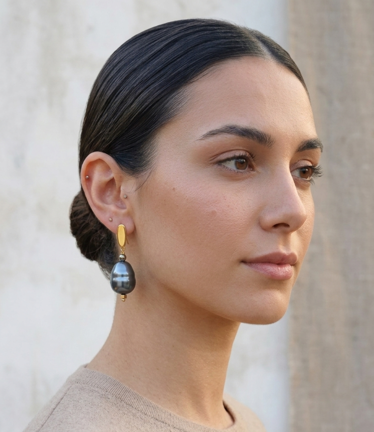 Σκουλαρίκια σταγόνα με μαργαριτάρι σε σκούρο γκρι χρώμα. Κομψό και διαχρονικό κόσμημα που προσθέτει φινέτσα και λάμψη σε κάθε εμφάνιση, ιδανικό για καθημερινές αλλά και επίσημες στιγμές.
