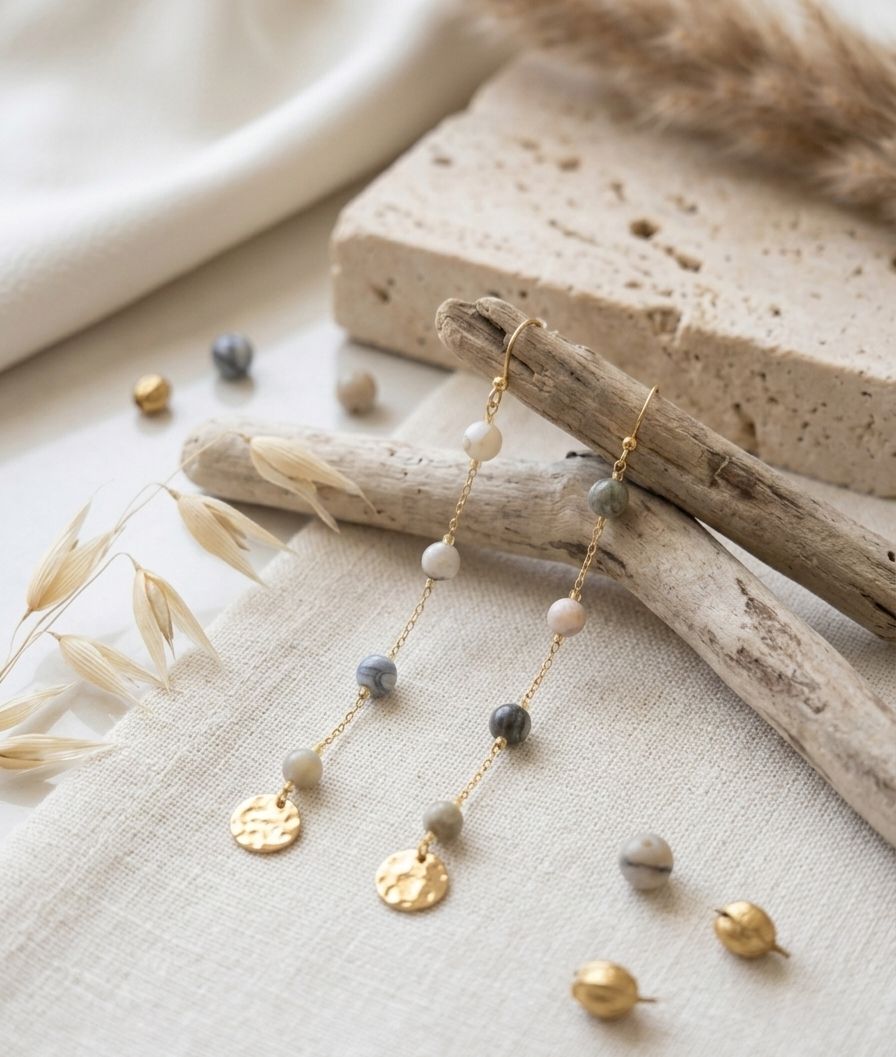 Κρεμαστά σκουλαρίκια τριών επιπέδων με φυσικούς λίθους, που προσφέρουν κίνηση και φωτεινότητα σε κάθε εμφάνιση. Η μοναδική υφή και χρώματα των φυσικών λίθων προσδίδουν φυσική ομορφιά και κομψότητα, ενώ ο χρυσός σκαλιστός κύκλος από ανοξείδωτο ατσάλι στο τελείωμα ολοκληρώνει το κόσμημα με μια διακριτική πολυτέλεια. Ιδανικά για καθημερινή χρήση ή ιδιαίτερες περιστάσεις, προσθέτοντας μια φωτεινή και κομψή πινελιά σε κάθε outfit.