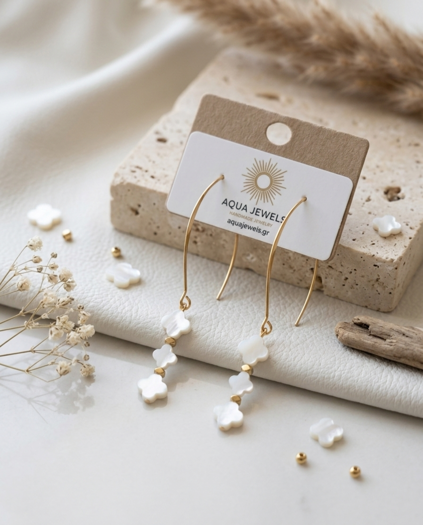 Σκουλαρίκια τύπου τριπλό τριφύλλι εμπνευσμένα από το στυλ Van Cleef, διακοσμημένα με φυσικό φίλντισι (mother of pearl) που αντανακλά απαλά το φως. Ο κομψός σχεδιασμός με τα τρία μοτίφ τριφυλλιού δημιουργεί ένα θηλυκό και διαχρονικό κόσμημα που προσθέτει πολυτέλεια και φωτεινότητα σε κάθε εμφάνιση. Ιδανικά για καθημερινή κομψότητα αλλά και για πιο ιδιαίτερες περιστάσεις.Υλικό: Φίλντισι (mother of pearl)